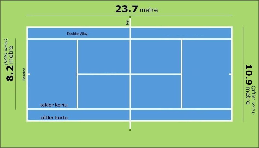 Tenis kortu 23.77 metre uzunluğunda ve 8.23 metre genişliğinde, dikdörtgen şeklindedir. Saha, ortadan boydan boya bir ağ ile ikiye bölünür. Ağ çapı en fazla 0.8 cm. ( 1/3 inç) olan bir ip veya metal kabloya asılır ve iki ucu, kenarları 15cm. (6 inç) geçmeyecek kare şeklinde veya 15 cm. (6 inç) çapında yuvarlak iki direğe bağlanır veya tepelerinden geçirilir. Direklerin yüksekliği, ip veya metal kablonun üst noktasından 2.5 cm. (1 inç) den fazla olmamalıdır.